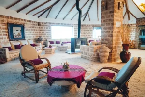 ボリビアのウユニ塩湖の端に位置する、豪華で隠れ家的なホテル。ホテルのほぼ全てが塩で造られており、ウユニ塩湖での滞在先として大変おすすめです。ホテル内は、鮮やかな色彩と古代の織物を用いたアンデスの温かみのある内装に、素朴なレンガや木材、塩のブロックが混ざり合い、まさにオンリーワンの雰囲気を醸し出しています。