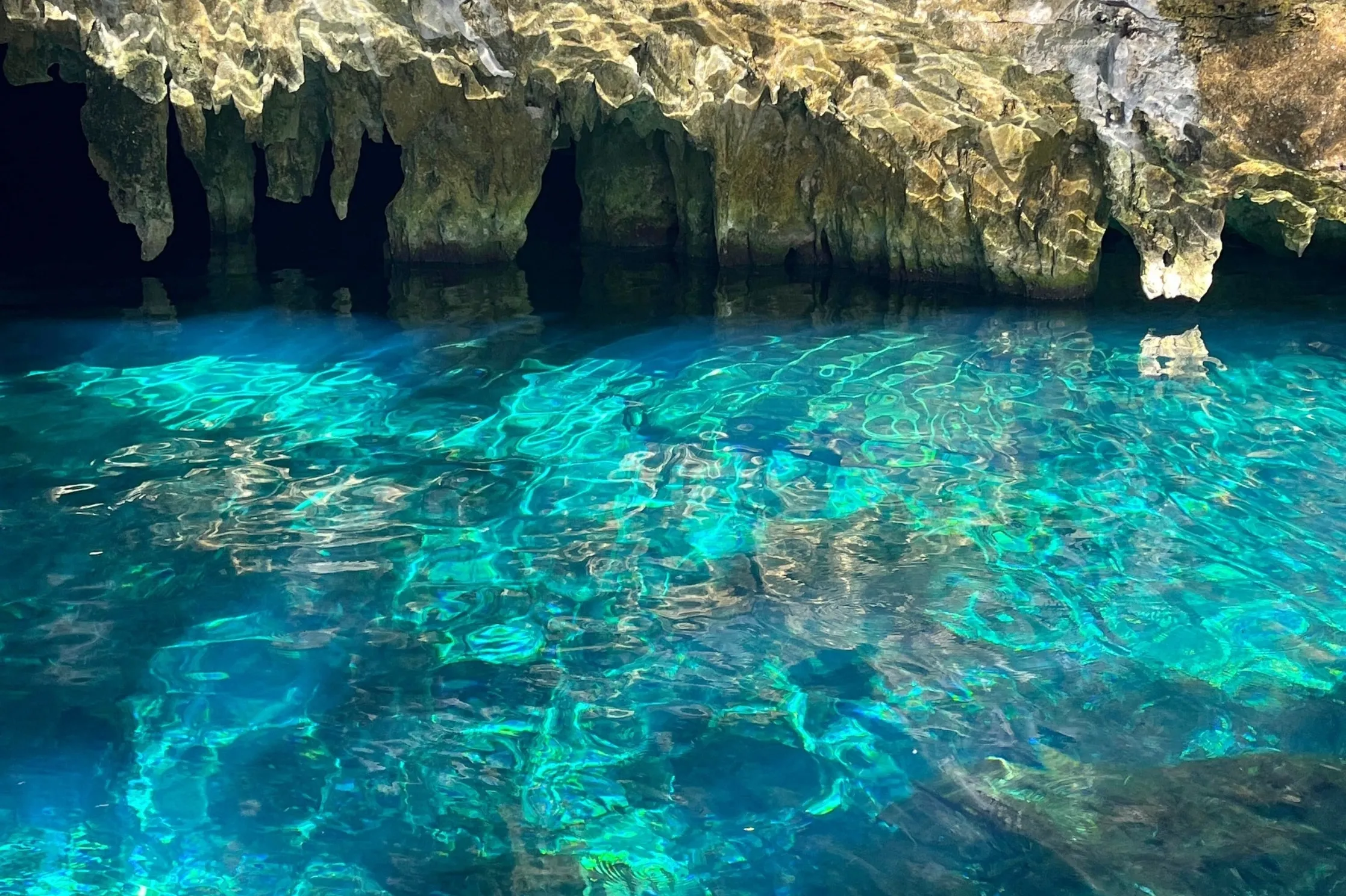 洞窟と青空がつながる神秘的な空間で、シュノーケリングや写真撮影に最適です。初心者でも安心して楽しめます。