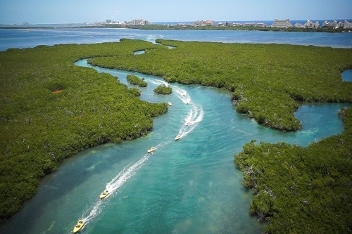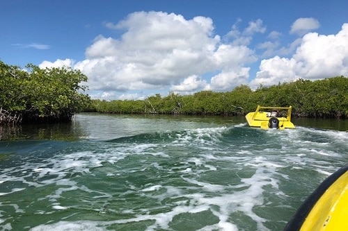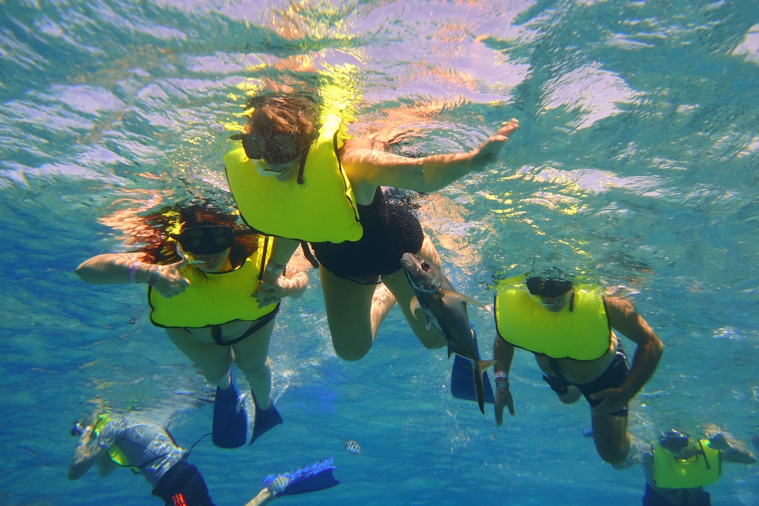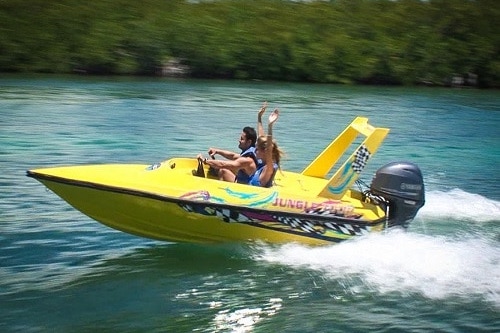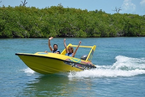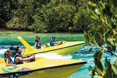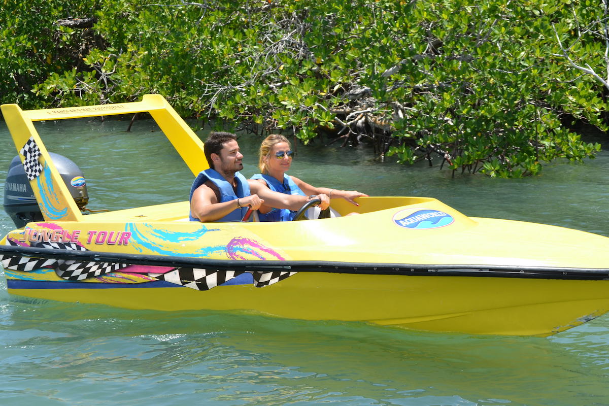 スピードボートでマングローブの水路を抜け、カリブ海ではシュノーケリングをエンジョイ!