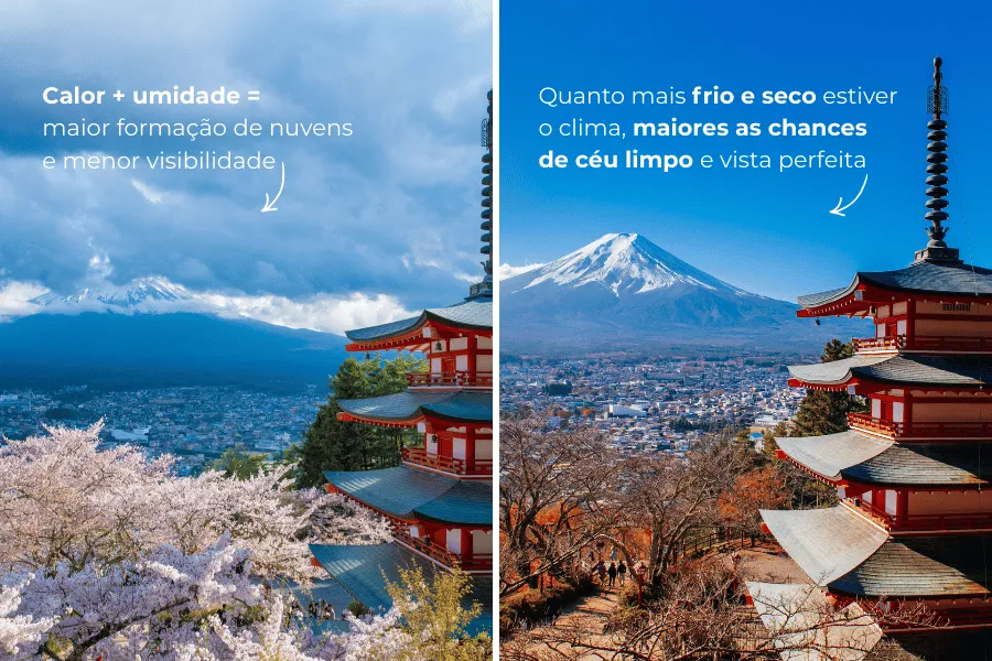 A visibilidade não depende exclusivamente da estação, mas das condições climáticas do dia. Mesmo no inverno, nuvens baixas podem ocultar a montanha. Por isso, é indispensável consultar dados em tempo real antes de sair de Tóquio.