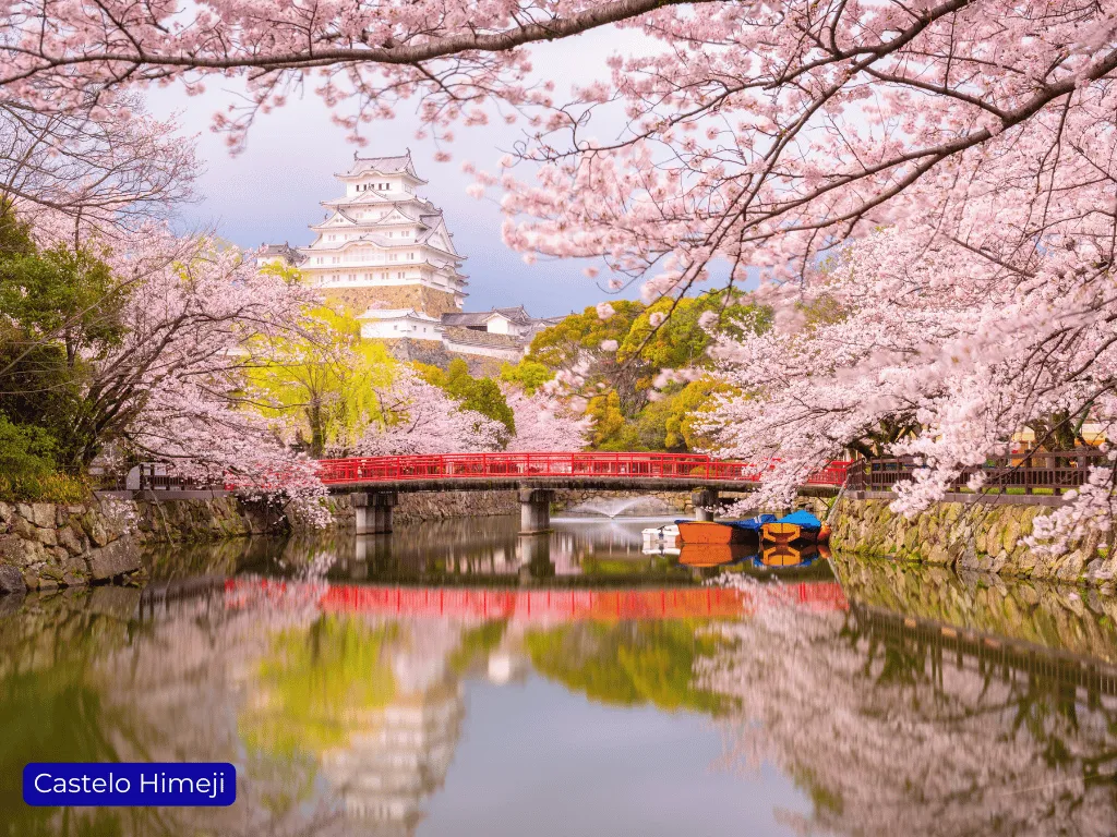 Cerca de 3.000 cerejeiras cercam o castelo, criando um dos cartões-postais mais famosos do Japão na primavera.