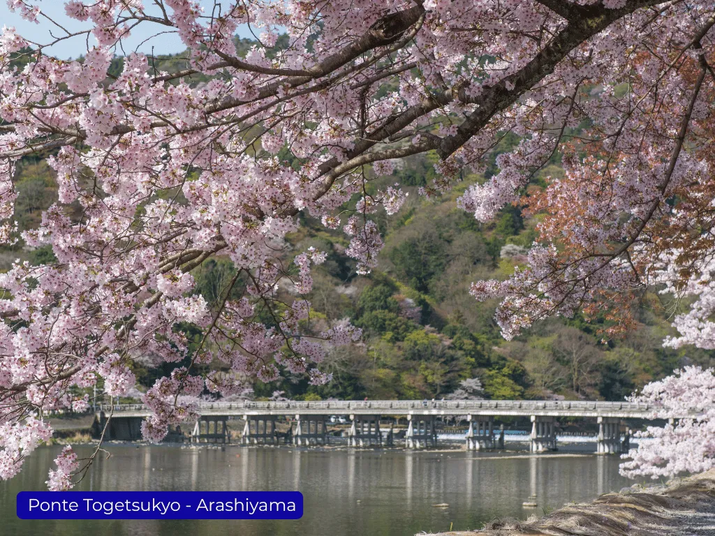 Localizada na região oeste de Quioto, Arashiyama é conhecida pela Floresta de Bambu e pelas paisagens naturais. Na primavera, as cerejeiras florescem ao redor da Ponte Togetsukyo e ao longo do rio Katsura, criando um dos cenários mais procurados para fotos.
